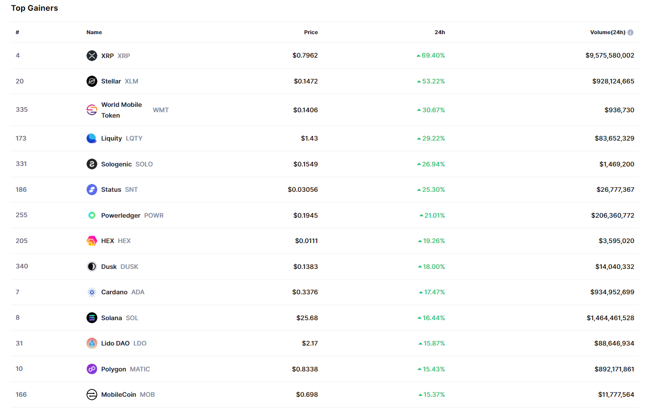 Kripto para sektöründe önemli bir günün sonuna gelmiş bulunmaktayız. Bugün itibariyle Ripple – SEC davasından gelen gelişmeler, XRP başta olmak üzere tüm kripto varlıkların ciddi miktarda yükseliş yaşamasını sağladı.