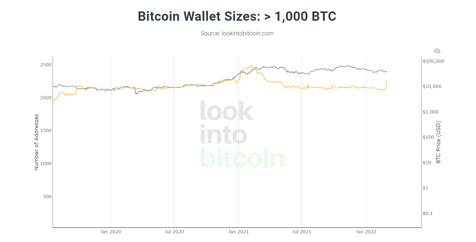 LookİntoBitcoin’in paylaştığı verilere göre 1000 Bitcoin’i aşkın kripto para cüzdanlarında devasa bir artış yaşanmaya devam ediyor.