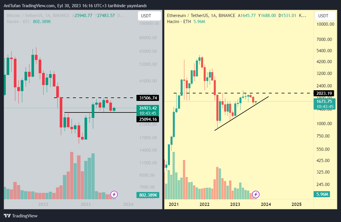 Bitcoin ve Ethereum bu ayın en düşük seviyesinden %10’luk bir sıçrama gerçekleştirdi. Aylık mumlara baktığımızda BTC’nin %3.79 ETH’nin ise %1.73 artıda olduğu görülüyor.