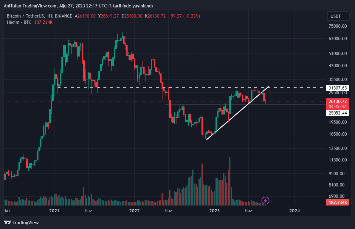 14 Ağustos haftasında yüzde 10’dan fazla değer kaybeden BTC, 25 bin dolar seviyelerine gerilemişti. BTC 25 bin dolar desteğinden ufak bir tepki alıp 26 bin dolara ulaşsa da, halen sert düşüşleri telafi edememiş durumda.