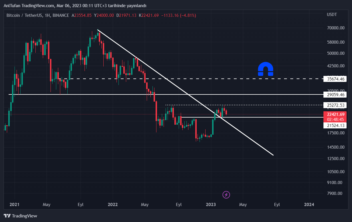 Birkaç denemeye rağmen bu ara direnç noktasını aşmayı başaramayan Bitcoin, bir sonraki denemesinde bu direnç noktasını aşarak 29 bin dolara kadar yükselebilir. BTC’nin 29 bin doları da aşması ise 36 bin dolar direncine kadar bir yükseliş getirecektir.