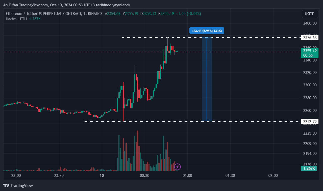 Son dakikalarda her ne kadar sahte ETF haberleriyle Bitcoin düşüş yaşamış olsa da, lider altcoin Ethereum (ETH) %6 oranında değer kazanmış durumda.