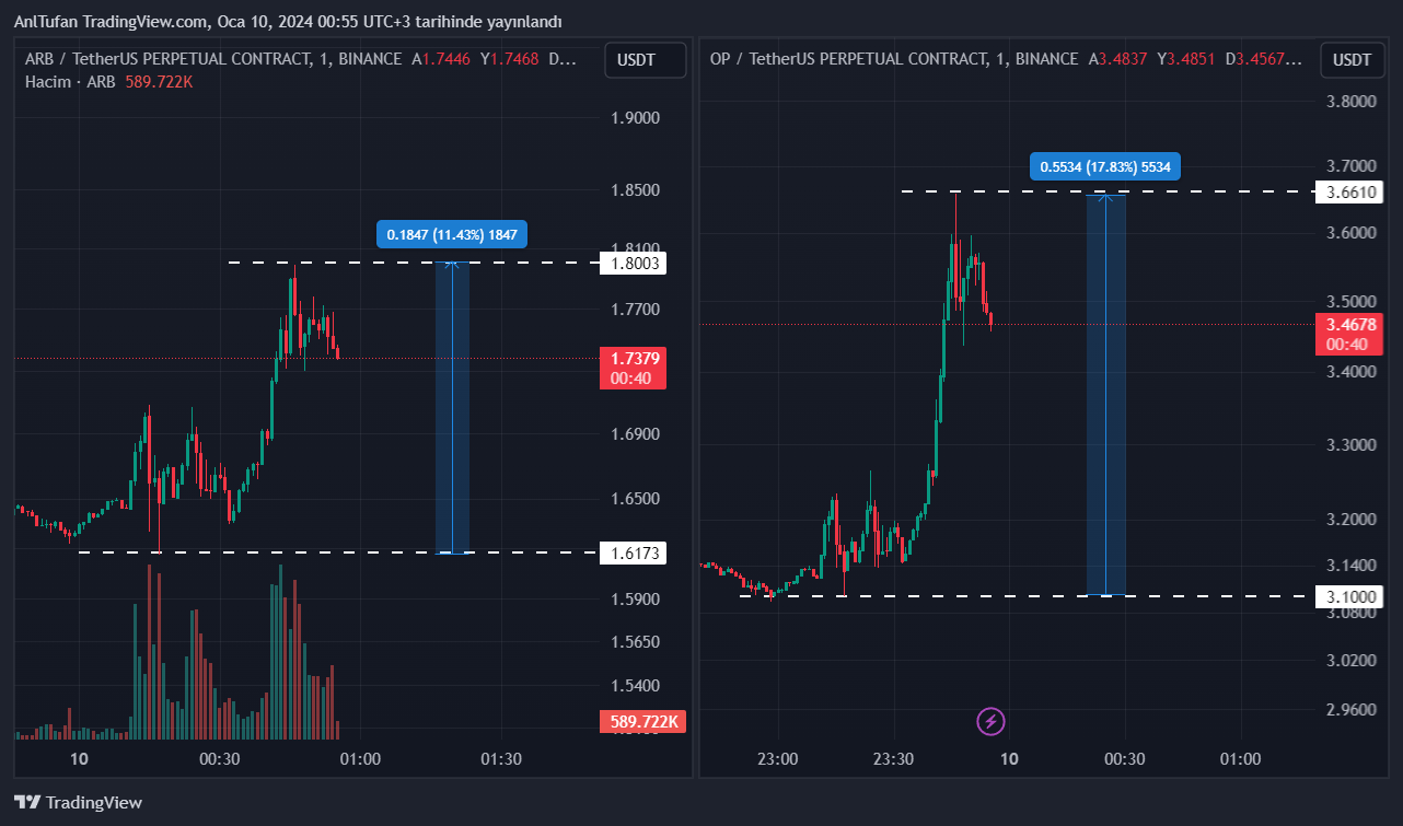 Ethereum ile birlikte Arbitrum (ARB), Optimism (OP) ve birçok bullish altcoin, bu yaşananlar doğrultusunda %10’dan fazla değer kazanmayı başardı.