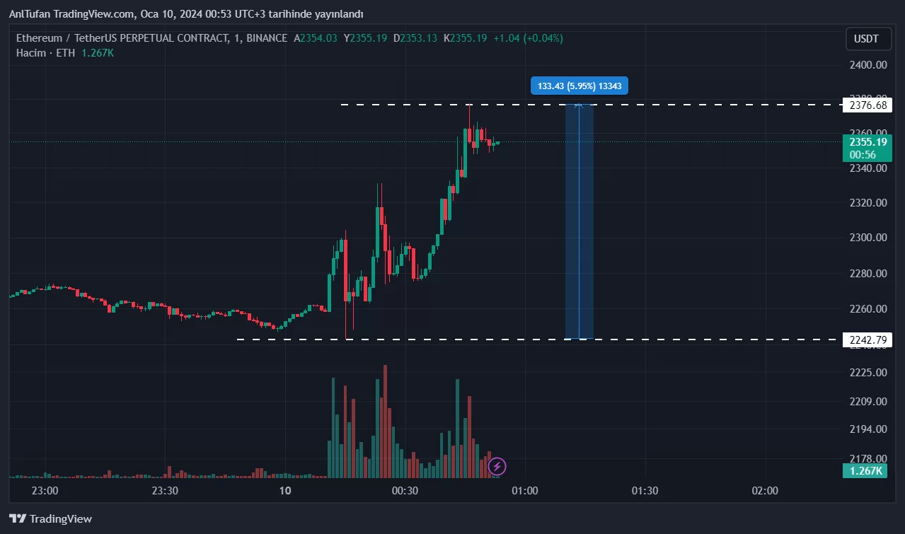 Son dakikalarda her ne kadar sahte ETF haberleriyle Bitcoin düşüş yaşamış olsa da, lider altcoin Ethereum (ETH) %6 oranında değer kazanmış durumda.