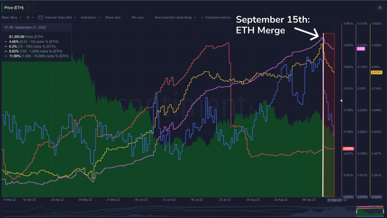 Başarılı bir veri sağlayıcısı olan Santiment’in aktardıklarına göre, balinalar Ethereum’un (ETH) Merge sonrası beklenen performansı verememesinden ötürü satış yaptıklarını söylüyor.
