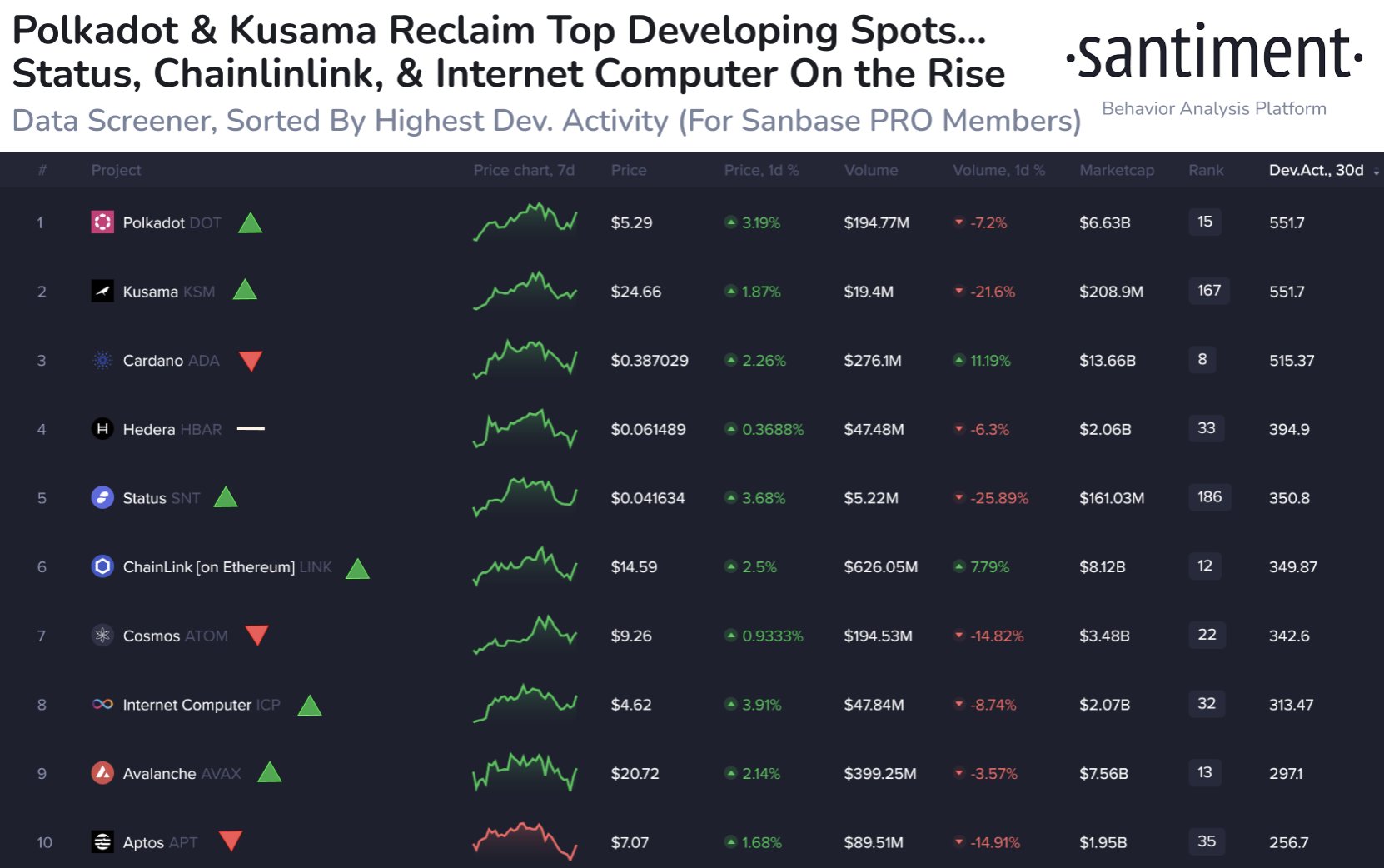 Listeyi incelediğimizde lider altcoin Ethereum‘un (ETH) 9. sırada olduğu görülüyor. Bu listeye göre sektörden ETH’den daha çok geliştirme faaliyeti gerçekleştiren 8 adet kripto varlık bulunmakta.