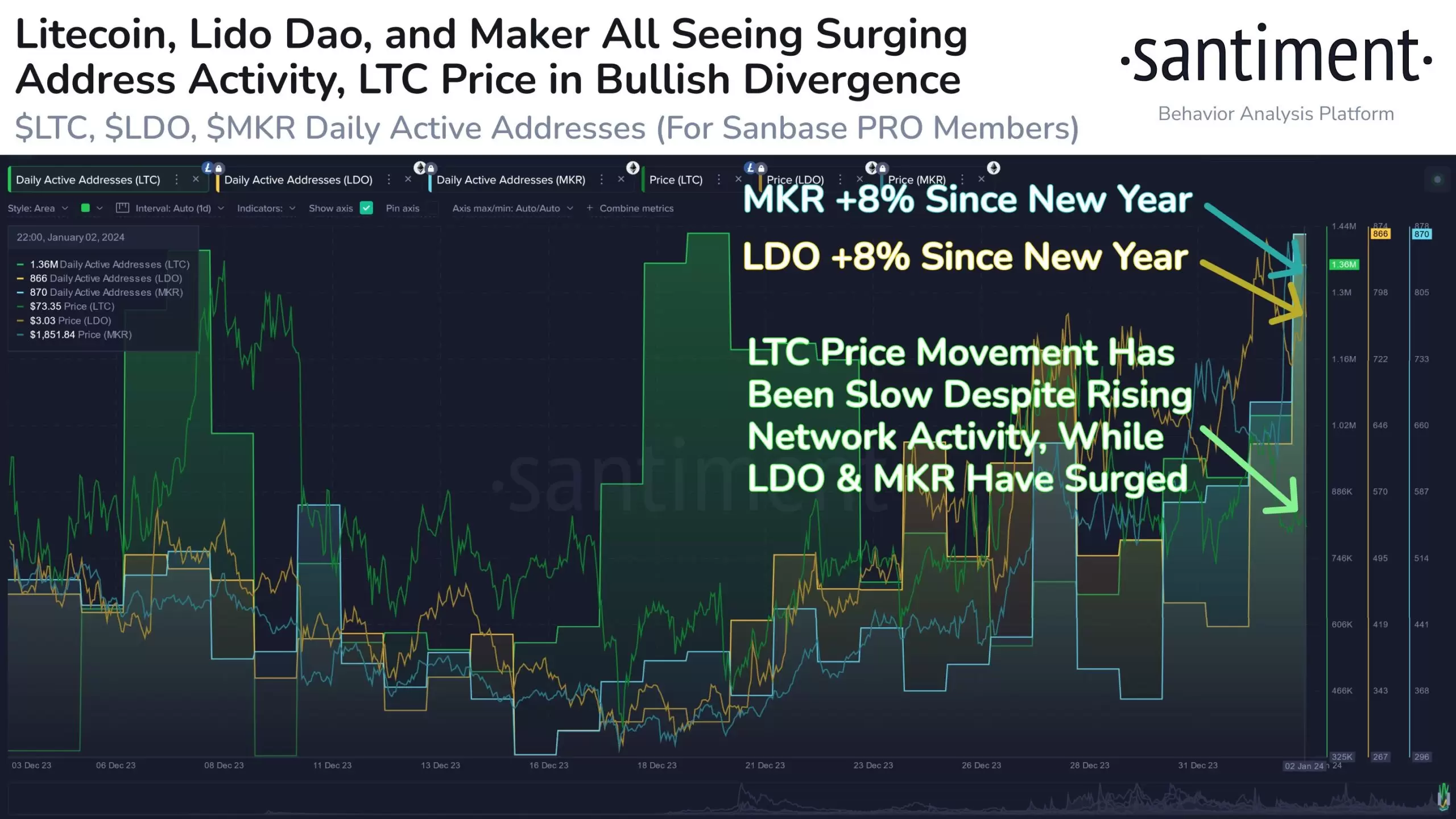 Litecoin (LTC), Maker (MKR) ve Lido DAO‘da (LDO) cüzdan aktivitesinin arttığını söyleyen Santiment, MKR ve LDO’nun bu artışlar ile yükselişe geçtiğini paylaştı: