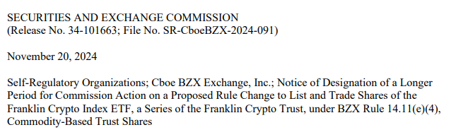Kısa bir süre önce ABD Menkul Kıymetler ve Borsa Komisyonu (SEC), kripto para ETF başvuruları hakkında yeni bir karar aldı. Son alınan karara göre SEC, Franklin Templeton‘un Bitcoin (BTC) ve Ethereum (ETH) ortak kripto endeks ETF’ine yönelik yaptığı başvuruyu erteledi.