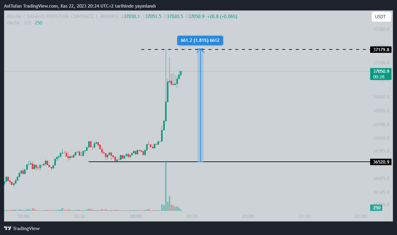 Dakikalar içerisinde %2’ye yakın bir sıçrama gerçekleştiren BTC, spot ETF onayı beklentisi ile birlikte yeniden 37 bin doları aşmayı başardı.