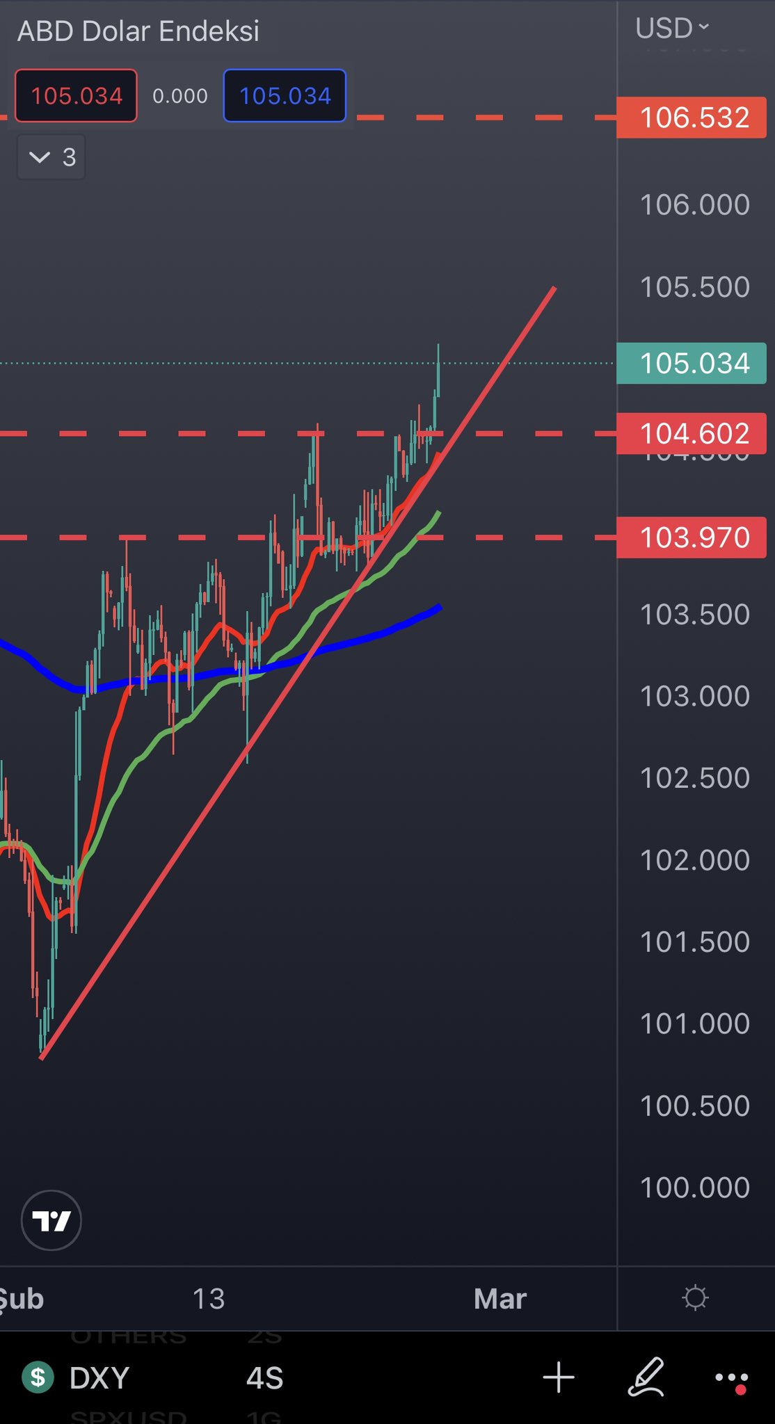 “Dxy direnç üstünde tutunuyor. trend aşağı kırılım verdiği an piyasaları rahatlatacaktır. Bu kırılım oluşana kadar ‘Kısa vadede’ piyasaların tedirgin olması ve ge”vşeme eğilimleri normal.