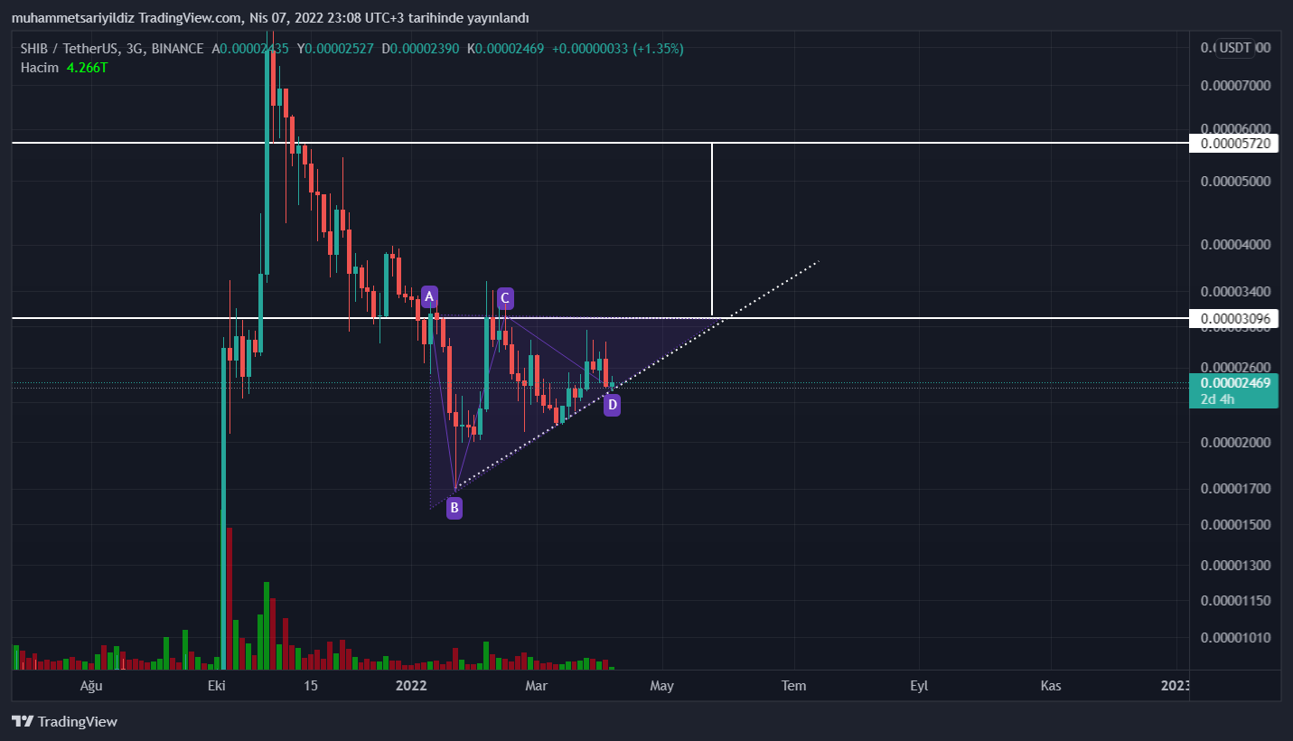 3 günlük grafik özelinde bir yükselen üçgen formasyonu oluşturan SHIB, yükselen trendinden destek almayı başardı.