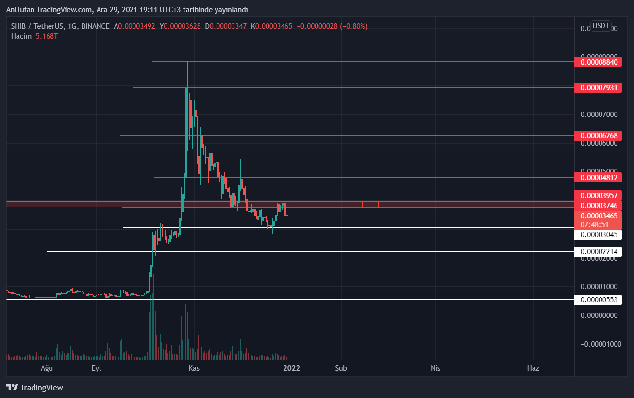 Yayın saati itibariyle 0.00003431 dolar seviyelerinde bulunan Shiba Inu, 0.00003746 – 0.00003957 sert direnç seviyesinden reddedilmiş durumda. Bu reddedilmenin ardından 0.00003045 dolar desteğine kadar inebilecek olan SHIB, BTC’den dönüş sinyali bekliyor.