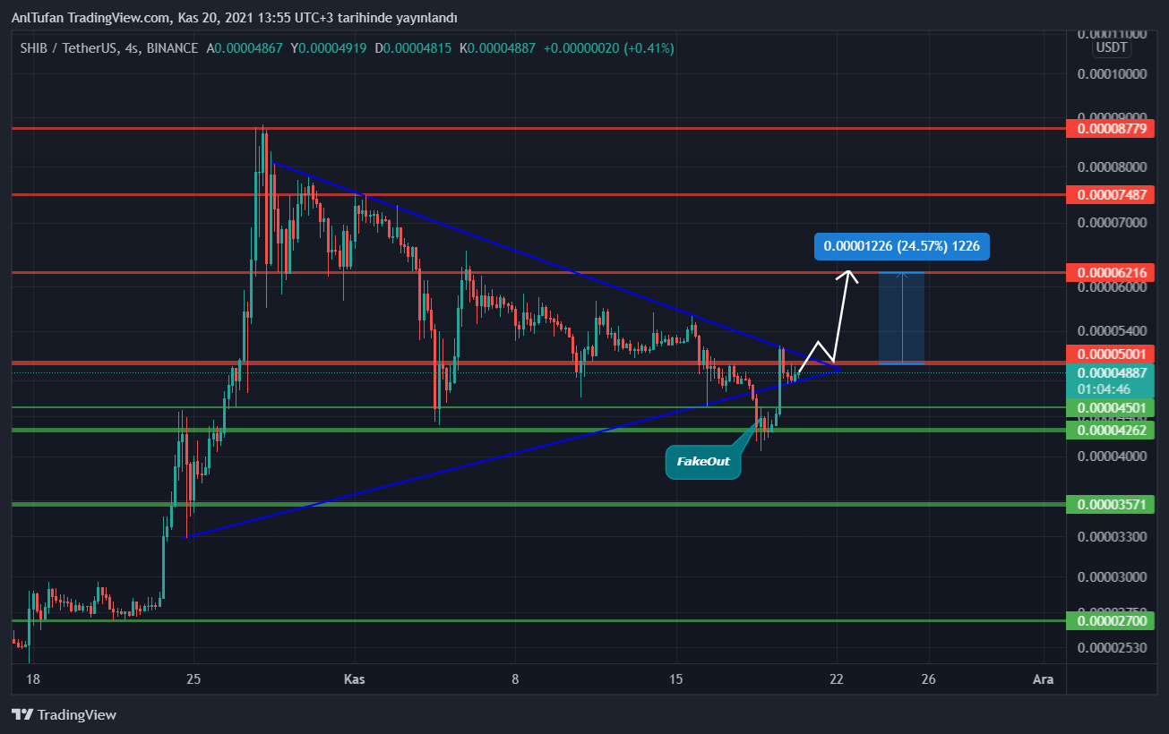 Aşağıda bulunan grafikte de belirttiğimiz gibi bu direncin ve üçgen formasyonun yukarı doğru kırılması durumunda sert yükseliş hareketi yapabilecek olan SHIB, 0.00006216 dolar direncine kadar yükselmesi beklenmekte.