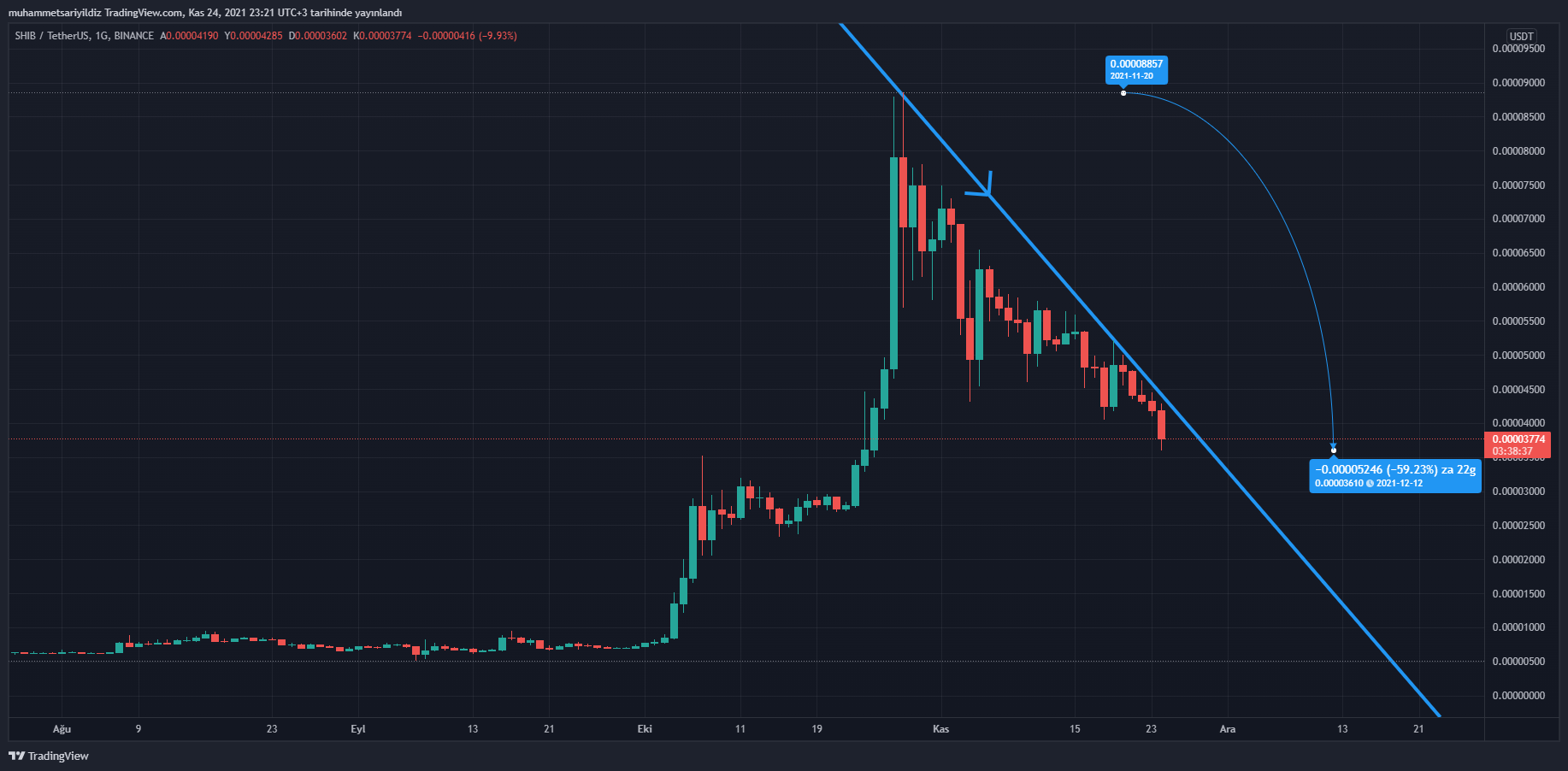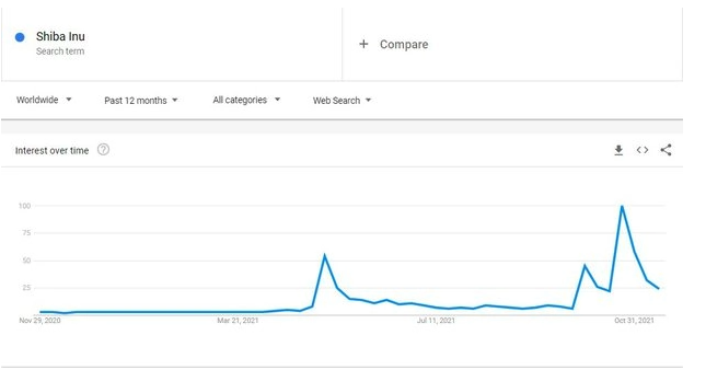 SHIB fiyatı ekim ayının sonlarında tüm zamanların rekoruna ulaşmıştı ve 28 Ekim tarihinde 0,00008854 dolar seviyesi görüldü. Bunun devamında 0,000038 dolara kadar çakılan SHIB’in popülerliği de benzer bir düşüş yaşadı.