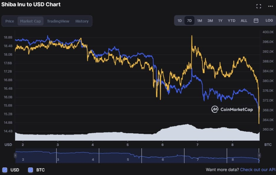 1 Ocak 2022 ve 8 Ocak 2022 tarihleri arasında SHIB’in piyasa değeri 18,68 milyar dolardan 14,19 milyar dolara kadar (mavi çizgi) sert bir düşüş yaşadı. Bu da SHIB’in 4,5 milyar dolarlık piyasa değer kaybı yaşadığını göstermekte. BTC bazında ise düşüşün çok daha sert olduğu net olarak görülebilmekte.