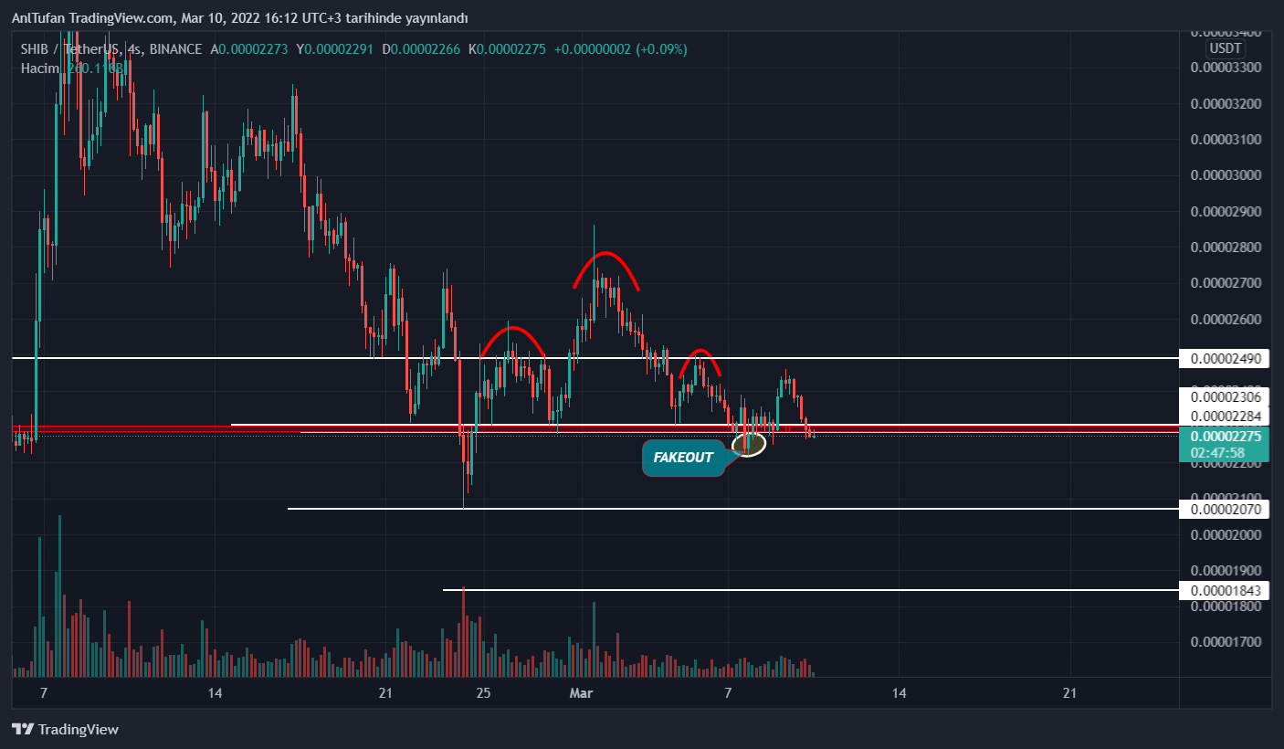 4 saatlik grafik üzerinde OBO formasyonu oluşturmuş olan SHIB, formasyonun boyun çizgi kırılımının ardından bir fakeout hareketiyle tekrar boyun çizgisinin üzerine attı.