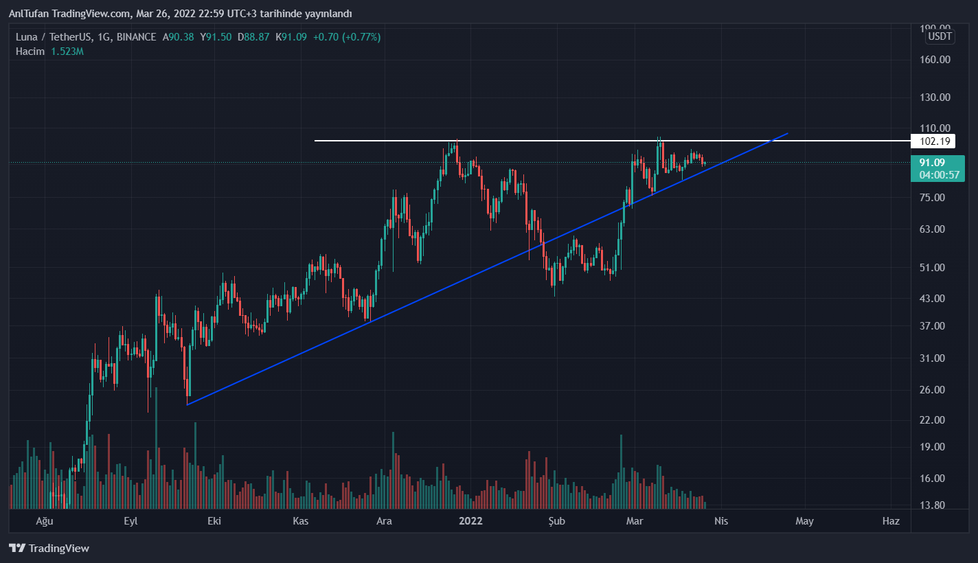 Yayın saati itibariyle 91 dolar seviyelerinde bulunan Terra Luna, halen ATH direnci olan 100 dolar seviyesini kıramamış durumda.