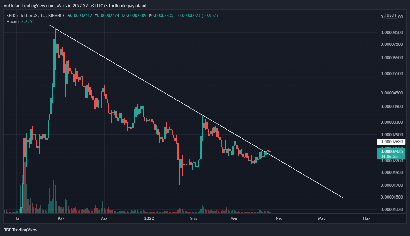 Haberimizin yazıldığı esnada 0.00002435 dolar seviyelerinde bulunan SHIB, düşen trendi kırmasının ardından yükselişe başlayamadı.
