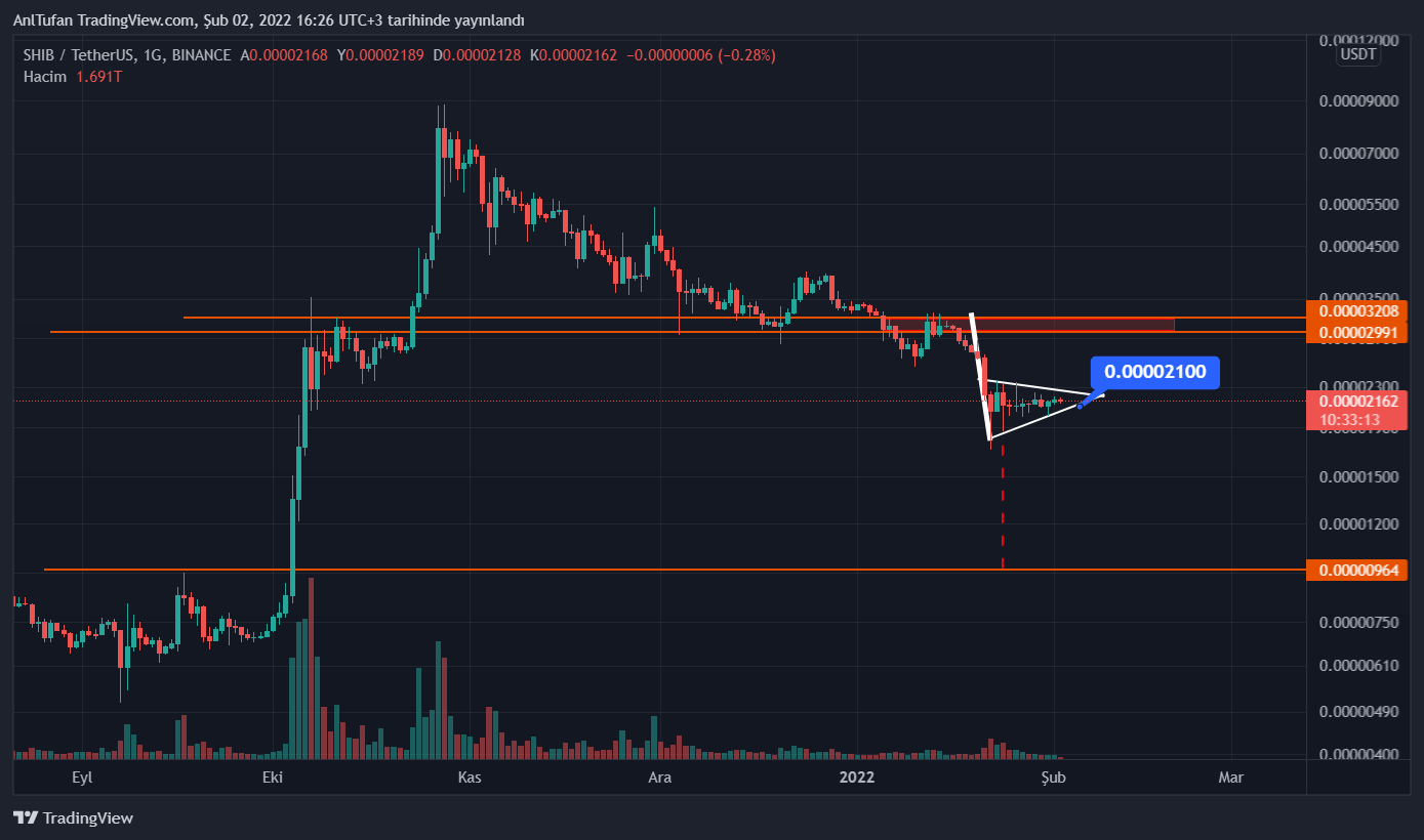 Shiba Inu’ya günlük grafikte göz attığımız takdirde ise kritik destek seviyelerinin kırıldığını görebilmekteyiz. Bir ayı flaması oluşturan Shiba Inu, bu flama kırılımının ardından çok sert düşüşler yaşayabilir.