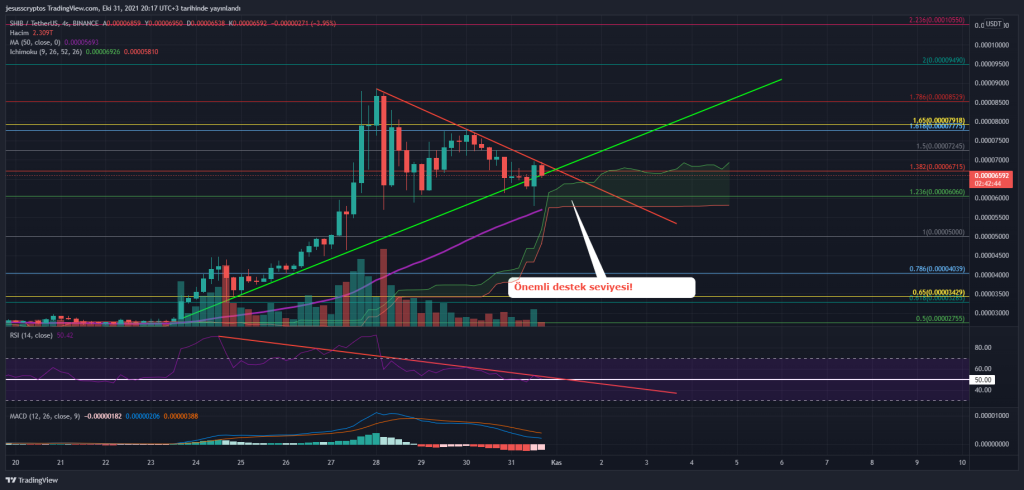 İlk etapta bu yükseliş süreci sonunda zirve seviyeden ciddi bir satış yiyen SHIB, düşüş sürecine geçti. Bu düşüş trendini değerlendirdiğimiz 4 saatlik grafik üzerinde 0.00006060 dolarlık önemli destek seviyesini koruyan SHIB, düşüş trendi direncini deniyor. Bu noktada başarısız olan SHIB’in gerilediği ve 0.00006715 dolar seviyesi altına gerilediği görülüyor.