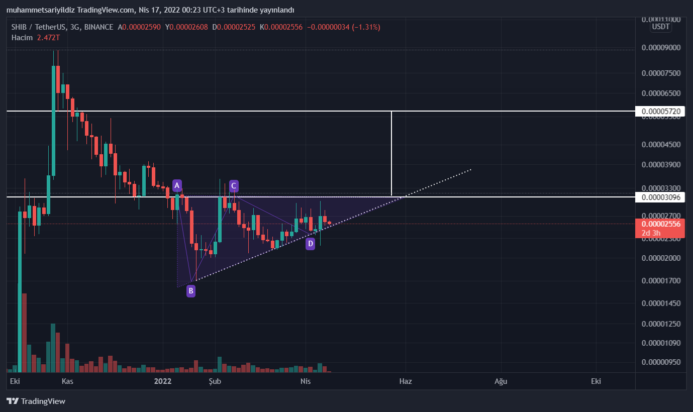 3 günlük grafik üzerinde yükselen üçgen formasyonu oluşturan SHIB, ilerleyen günlerde yükselen trendini kaybetmemesi halinde en geç 21 Mayıs tarihinde yukarı yönlü bir kırılım yapmayı başaracak.