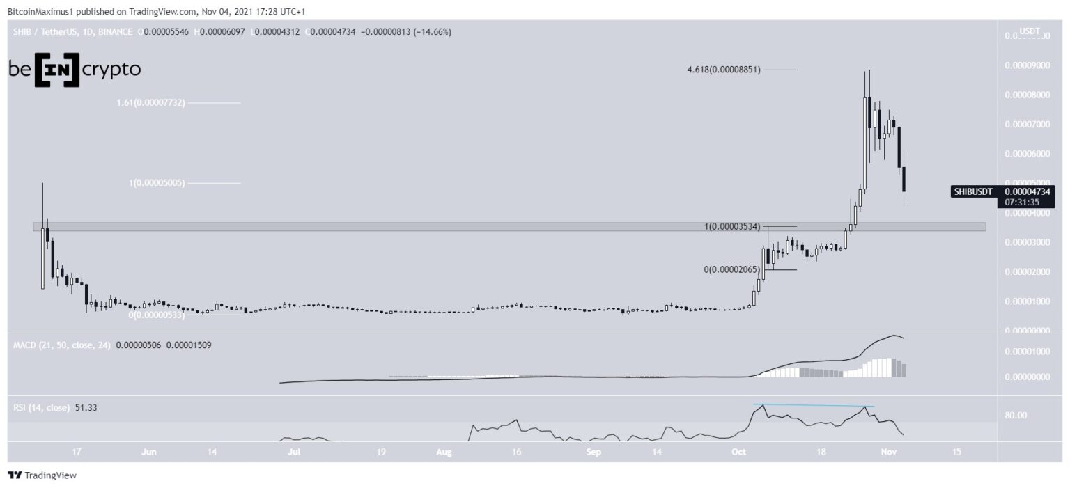 Shiba Inu mayıs ayında aşağı yönlü bir hareket sergilerken en yüksek Fib geri çekilme seviyesi 1.61 olduğu görülmekte. Ekim ayında ise 4.618 seviyesi arasında işlem yapıyor. Ayrıca, RSI’deki ayı uyuşmazlığı ile birleşti.