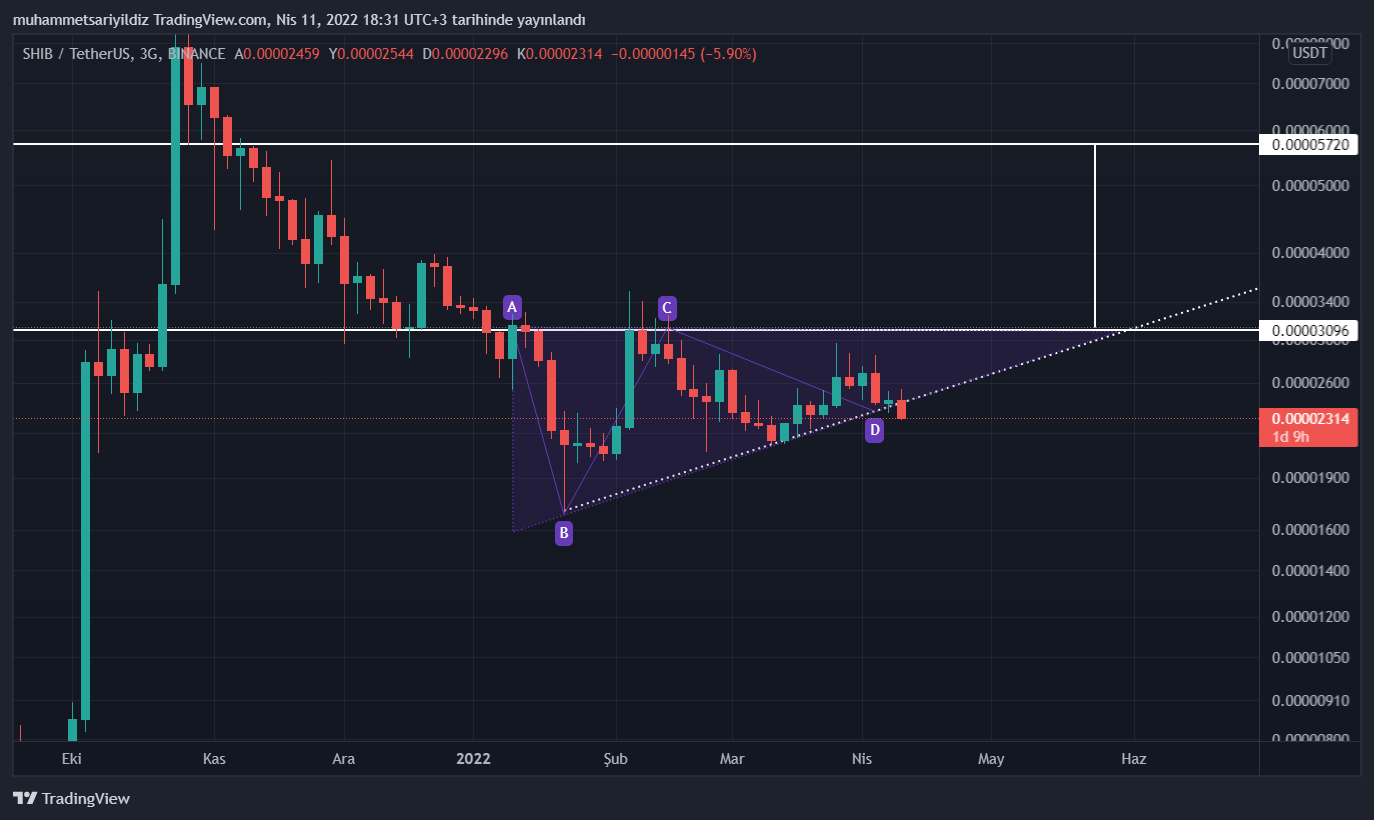 Haberimizin yazıldığı esnada 0.00002318 dolar seviyelerinde bulunan Shiba Inu, yükselen üçgen formasyonunun altına sarkmış durumda.