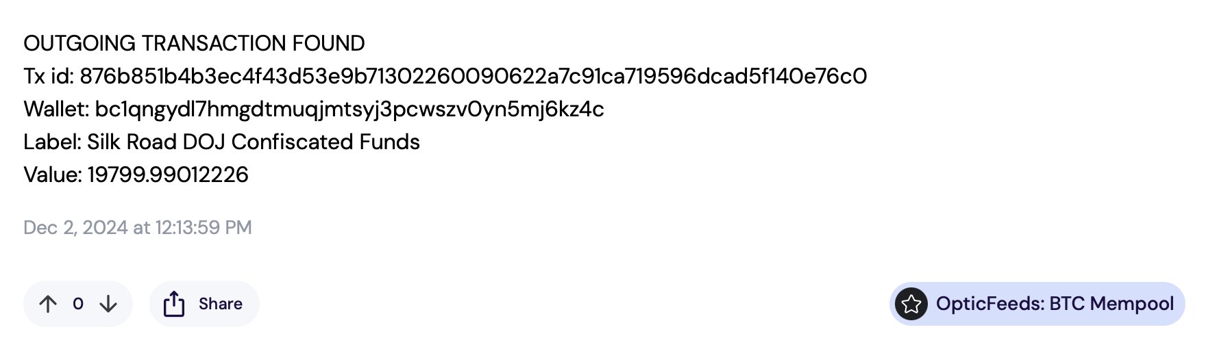 Kısa bir süre önce paylaşılan zincir içi verilere göre ABD Adalet Bakanlığının (DOJ) Silk Road davasında el koyduğu fonlar hareket ettirildi. Şuan itibariyle aktarılanlara göre DOJ toplamda 19.799 adet Bitcoin (BTC) transferi gerçekleştirdi.