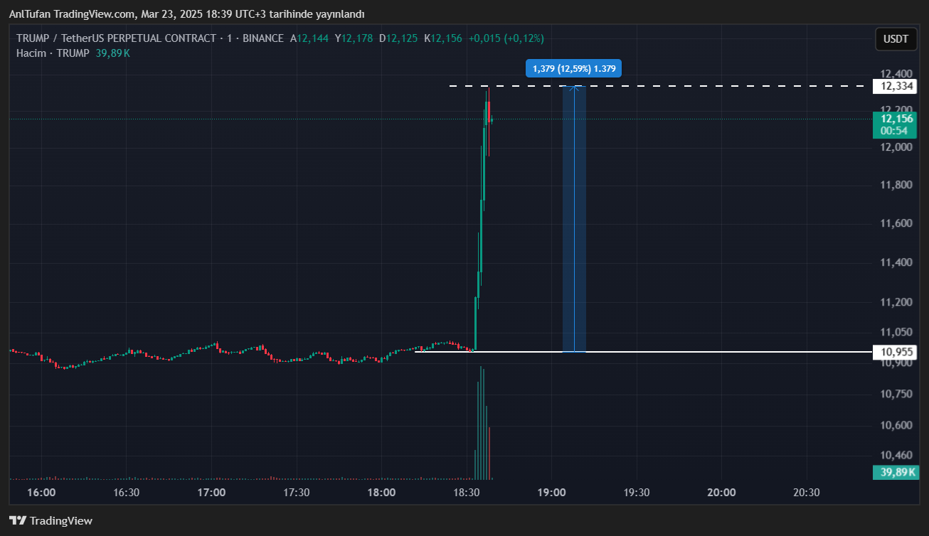 Son dakikalarda Donald Trump’ın açıklaması sonrasında ise TRUMP’ın fiyatında ani yükselişlerin yaşandığı görüldü. Dakikalar içerisinde %12 oranında değer kazanan TRUMP, yatırımcıların dikkatini çekti.