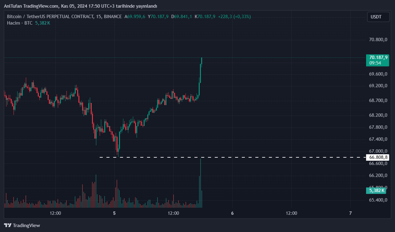 Son dakikalarda daha da alevli bir şekilde yükselmeye başlayan Bitcoin (BTC), 70 bin dolar seviyelerini aşmış durumda. BTC dün akşam saatlerinde 66.800 dolar seviyelerini görmüş olsa da, kısa bir süre içerisinde toparlanmayı başardı.