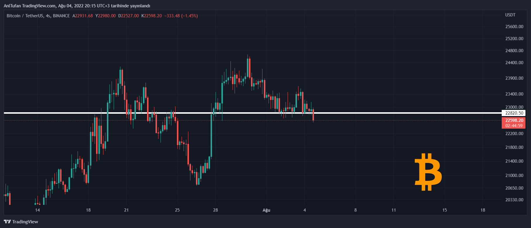 Lider kripto para birimi olan Bitcoin her ne kadar şimdilik 22.800 dolar desteğini kaybetmiş olsa da, halen bu seviyenin altında bir 4 saatlik kapanış gerçekleştirmedi.