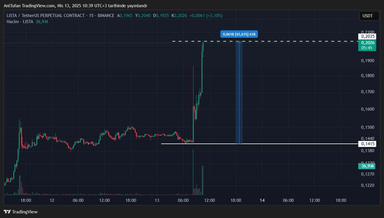 Son dakikalarda toplamda %43 oranında değer kazanan LISTA, halen son saatlerin en yüksek seviyesinde işlem görüyor. LISTA’daki yükselişlerin bir süre daha devam etmesi, popüler altcoin’in tam anlamıyla kripto gündemine oturmasını sağlayabilir.