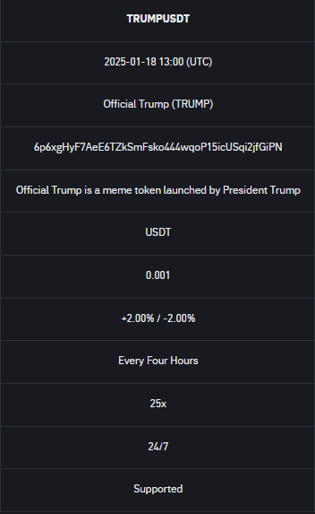 Geçtiğimiz dakikalarda dünyanın en büyük kripto para borsası Binance yeni bir altcoin vadeli listelemesi paylaştı. Son gelen bilgilere göre yeni ABD başkanı Donald Trump’ın kendisinin çıkarttığı memecoin olan OFFICIAL TRUMP (TRUMP), Binance vadeli piyasada listelenecek.