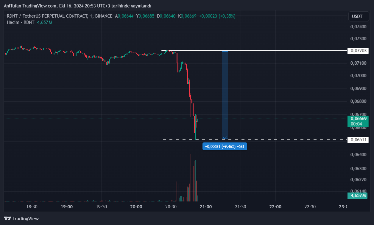 Haberlerin gelmesi sonucunda RDNT fiyatında ani düşüşler meydana geldi. Dakikalar içerisinde 0.072 dolardan 0.0651 dolara kadar gerileyen RDNT, %10’luk bir geri çekilme yaşadı.