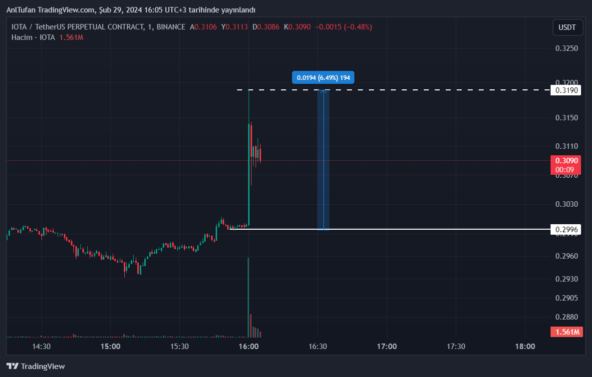 Kısa bir süre içerisinde Binance vadeli piyasada 0.319 dolar seviyelerine kadar yükselen IOTA, son dakikalarda %6.5 oranında değer kazandı.