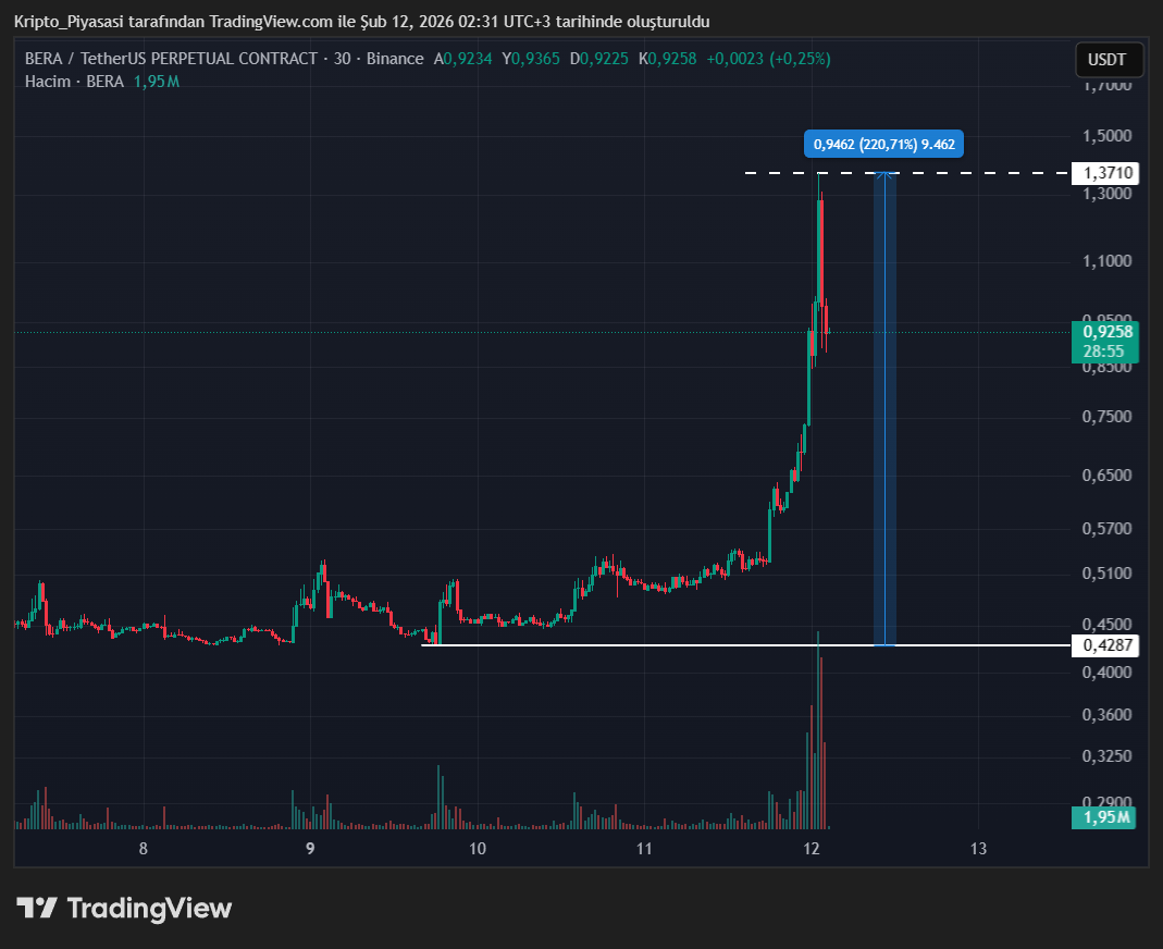 Çok kısa bir süre içerisinde 0.428 dolardan 1.37 dolar seviyelerine kadar %220’lik bir yükseliş yaşayan BERA, değerini üçe katlamayı başardı.