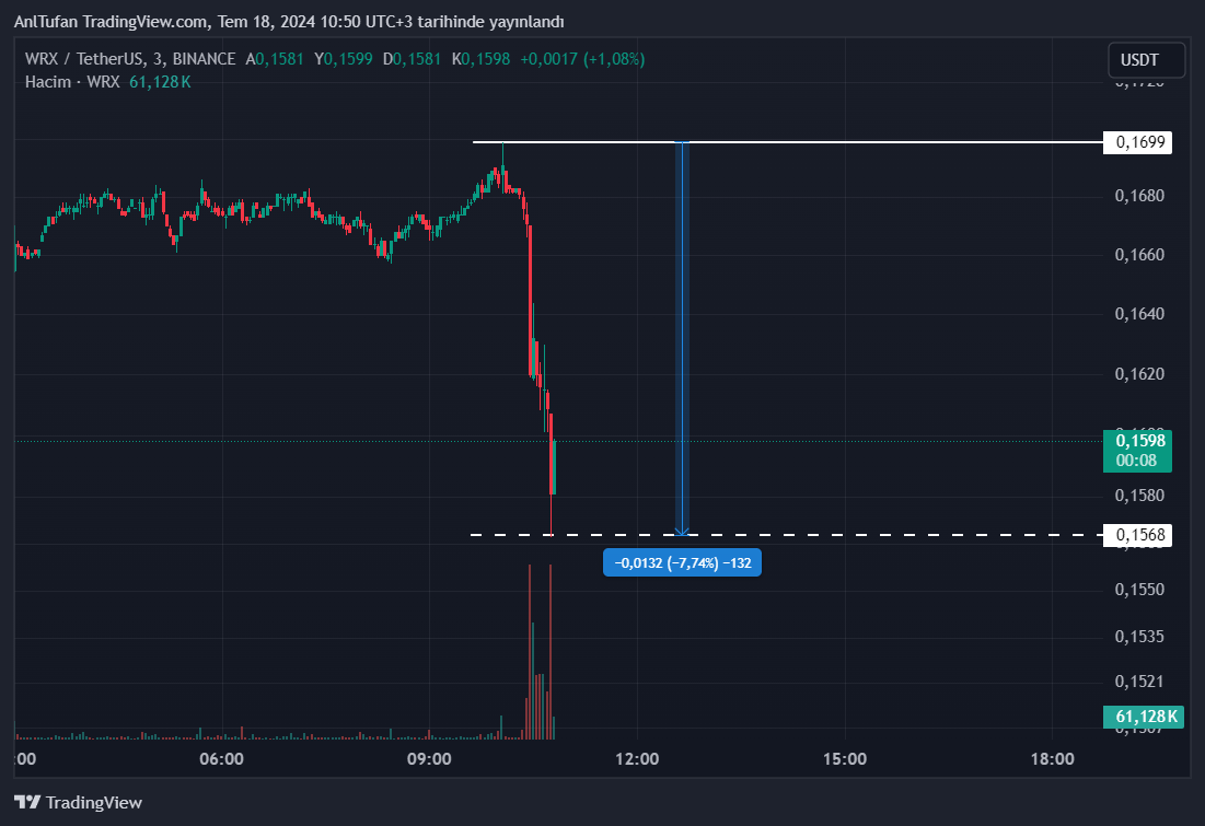 Son dakikalarda WRX’in fiyat hareketlerine baktığımızda, hack saldırısı ile birlikte bir anda %8’e yakın bir düşüş yaşadığı görülüyor. WRX bu düşüşler sonrasında halen toparlanmayı başaramadı.