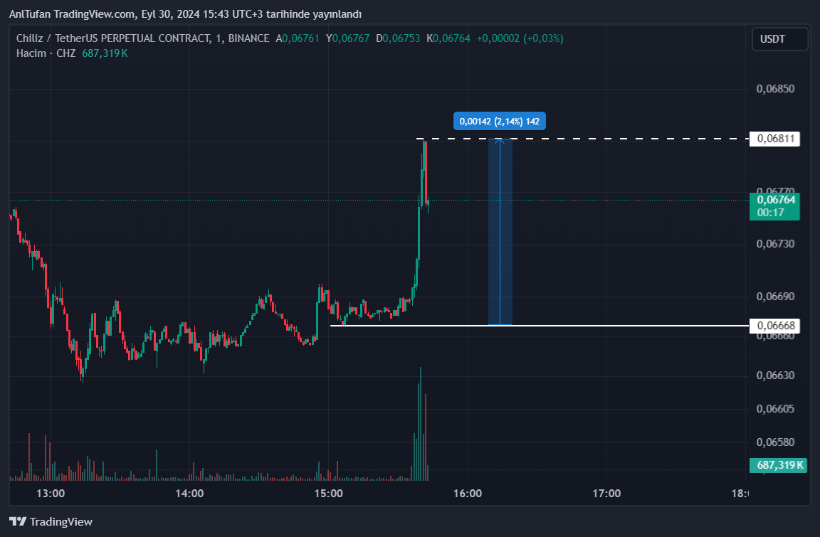 Gizemli paylaşım ile birlikte CHZ fiyatında yükselişler meydana geldi. 0.0666 dolardan 0.0681 dolara %2’lik bir sıçrama yaşayan CHZ, bugün yaşadığı düşüşleri telafi etmeye çalışıyor.