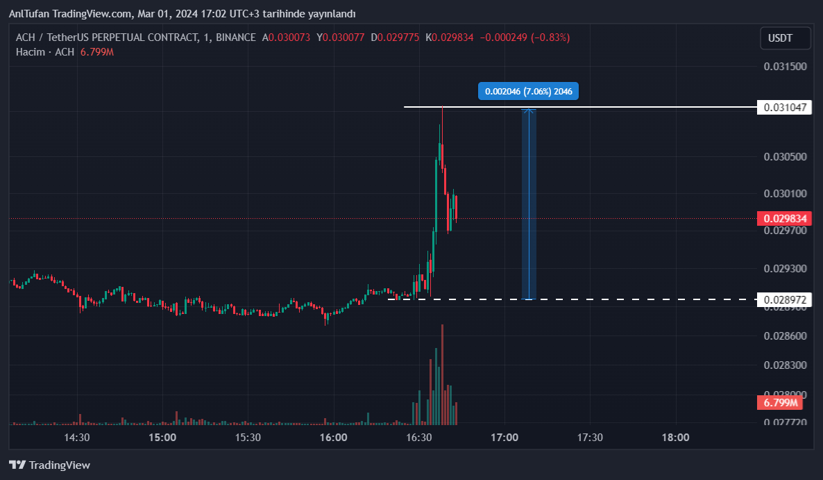 ACH isimli altcoin son dakikalarda Binance vadeli piyasada 0.031 dolar seviyelerine kadar yükseliş yaşadı. Kısa bir süre içerisinde %7 oranında değer kazanan ACH, dikkatleri üzerine çekti.