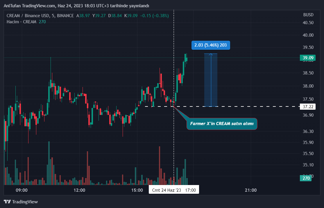 Farmer X isimli kripto yatırım şirketi 15 Haziran tarihinde de KuCoin’den 42.767 adet CREAM (1.6 milyon dolar değerinde) satın almıştı.