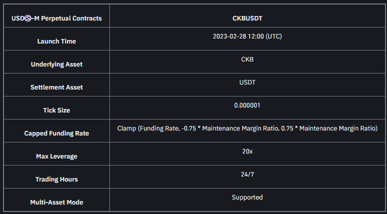 “Binance Futures, 20 kata kadar kaldıraçla 28-02-2023 15:00 (tsi) tarihinde USDⓈ-M CKB kalıcı sözleşmelerini başlatacak.”