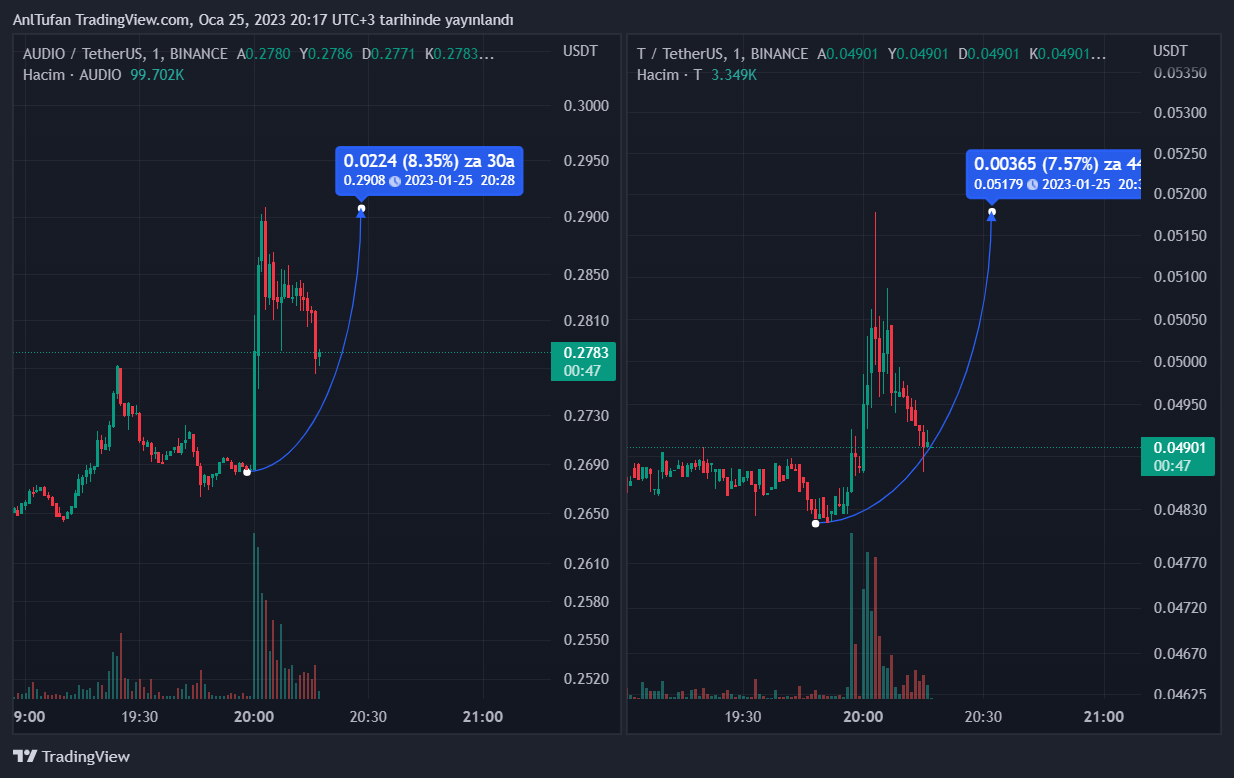 Son duyurunun ardından bu 2 ürünü resmi olarak listeleyen Coinbase, AUDIO ve T’nin dakikalar içerisinde ortalama yüzde 8 oranında değer kazanmasını sağlamış durumda.