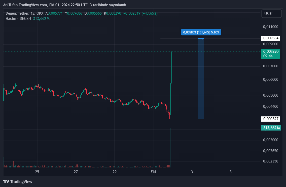 Bu son gelen listeleme duyurusu IO isimli altcoin’in fiyatını etkilememiş olsa da, DEGEN isimli altcoin’de sert yükseliş getirdi. DEGEN son dakikalarda Coinbase listelemesi ile birlikte %151’lik ani bir sıçrama gerçekleştirdi.