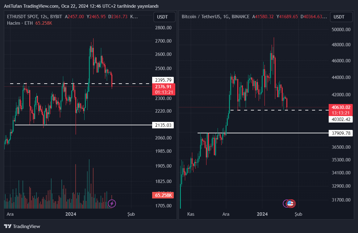 Şuan itibariyle Bitcoin 40.300 dolar desteğinde işlem görürken, Ethereum ise 2.395 dolar desteğinin bir miktar altına sarkmış durumda.