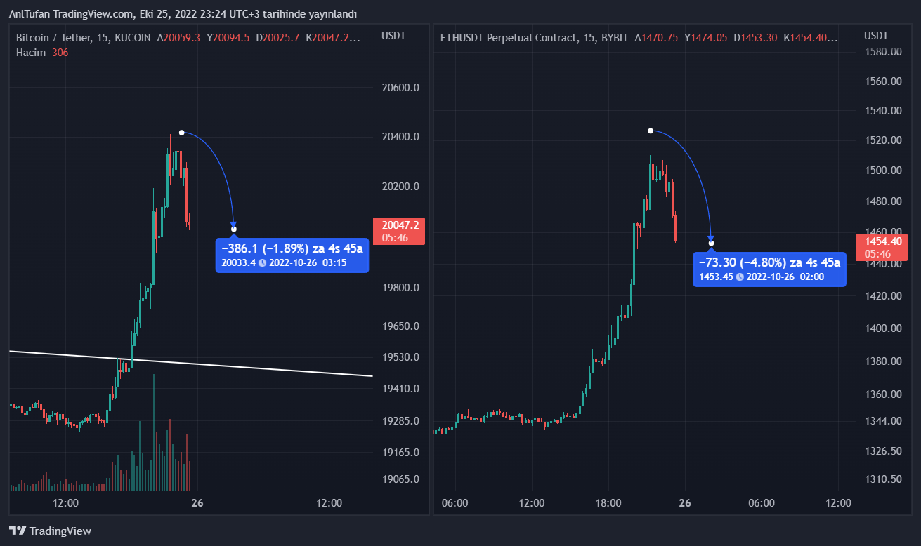 Kripto para sektöründe hareketli saatler yaşanıyor. Her ne kadar Bitcoin 20.450 dolara Ethereum ise 1.525 dolara ulaşmış olsa da, son dakikalarda sektörde bir geri çekilmenin yaşandığı dikkat çekmekte.