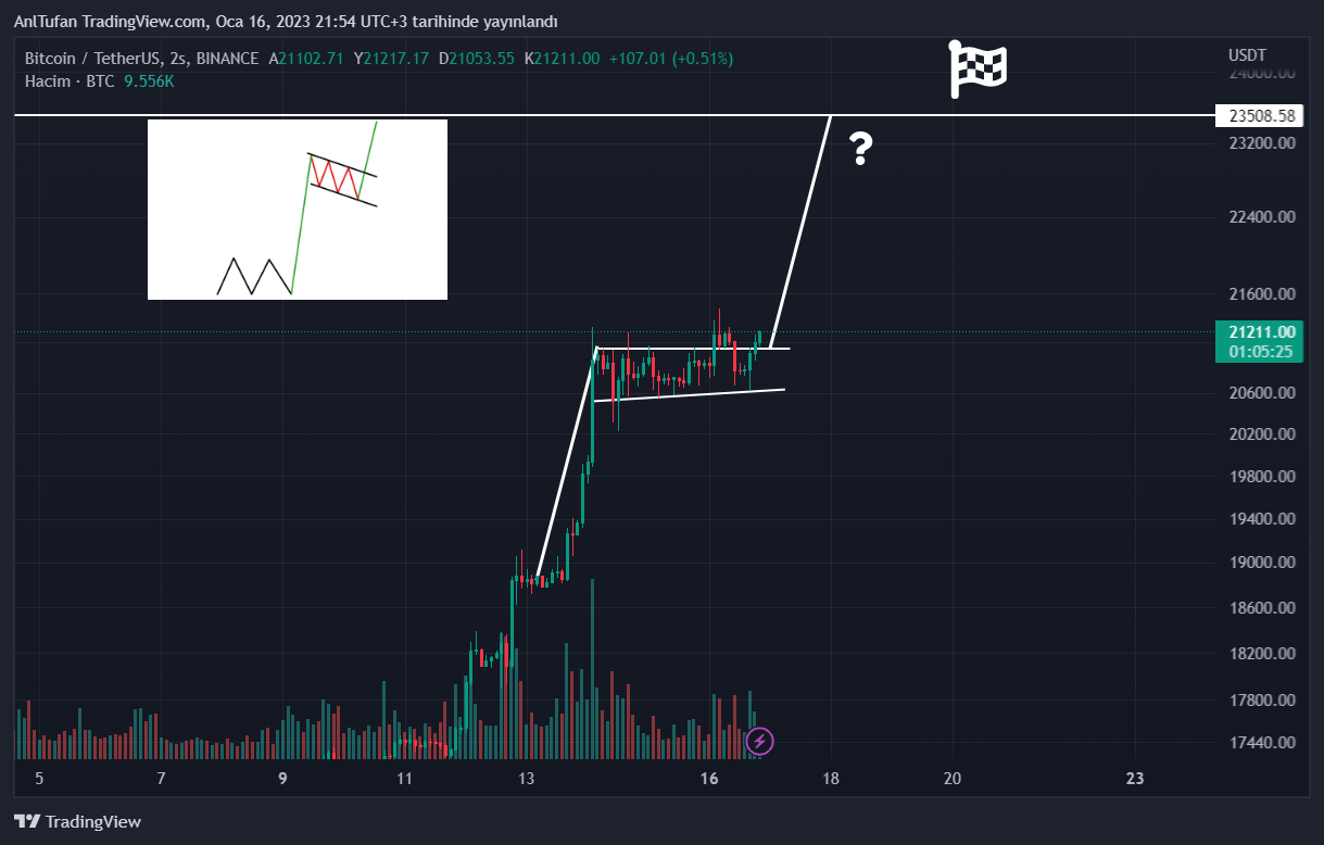 Bitcoin’in sert rallisinin ardından 2 gündür tepe seviyelerde bir boğa bayrağı oluşturmaya başladığı gözlemlenmişti. 20.500 – 21 bin dolar aralığında bir süre akümüle olan BTC, son dakikalarda ise bu boğa bayrağı formasyonunu yukarı yönlü kırmaya başladığı görülüyor.