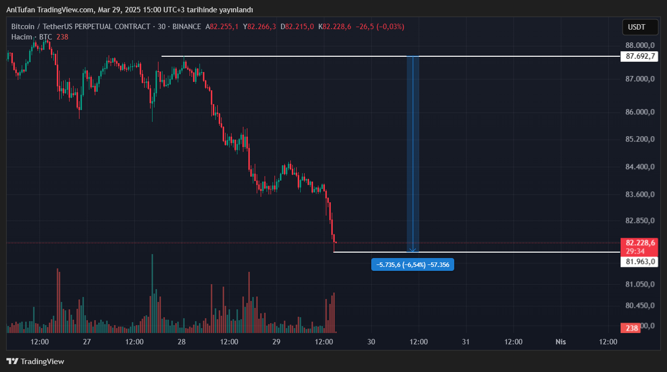 Lider kripto para birimi Bitcoin (BTC) haberimizin yazıldığı esnada 82.200 dolardan işlem görüyor. Dün özelinde 87.629 dolardan başlayan bu düşüş trendi, bir türlü kırılamamış durumda.
