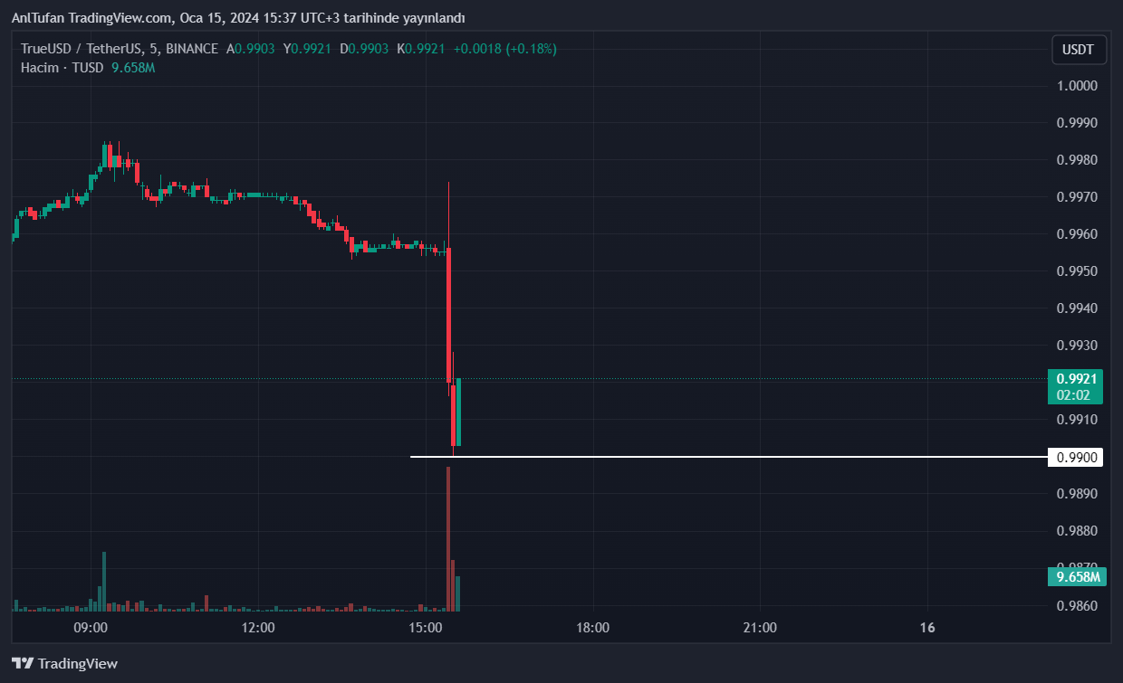 Dönem dönem 1 dolara sabitliğini kaybedip 0.995 dolar seviyelerine kadar gerileyen TUSD, son dakikalarda ise Binance’in yeni kararı ile birlikte 0.99 dolara geriledi.
