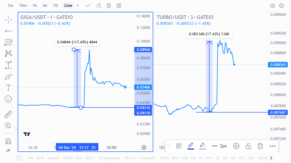 SEC’in baskılarından kurtulan ABD’li dev borsa son paylaştığı listeleme haberleri sonucunda GIGA ve TURBO’da sert yükselişler getirdi. GIGA haberler ile birlikte %100’den fazla artsa da yükselişlerini korumayı başaramadı.