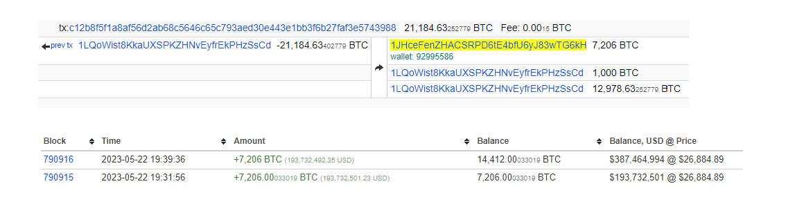 “En Büyük 3. Bitcoin balina cüzdanı 7,206 Bitcoin’i daha cüzdanından çıkarıp aynı cüzdana gönderdi. Toplamda aktarılan miktar 14,412 BTC’ye ulaştı.”